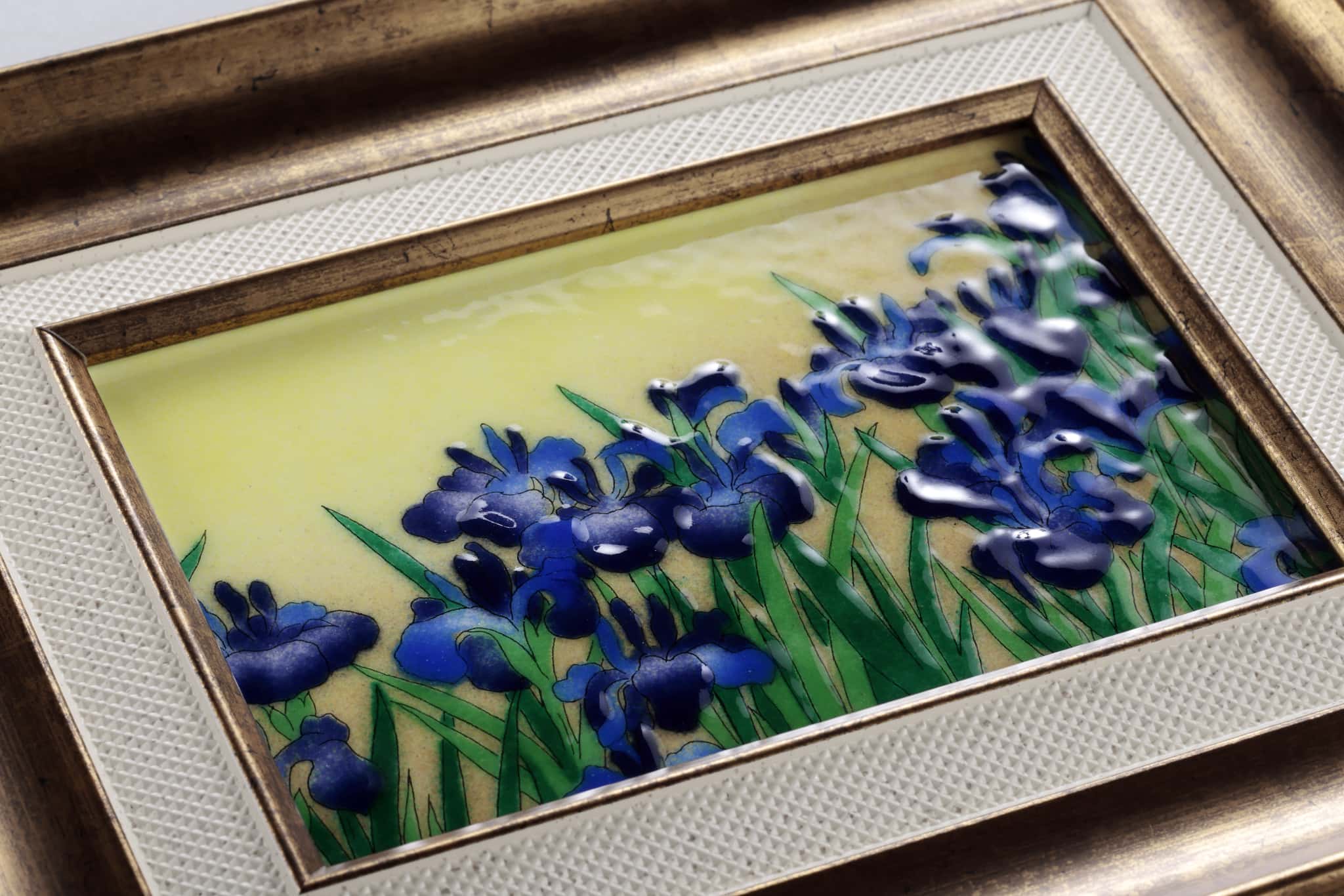 七彩工房では伝統工芸、京七宝焼の技法「染め型七宝」の技法を用いて絵画を制作しています。