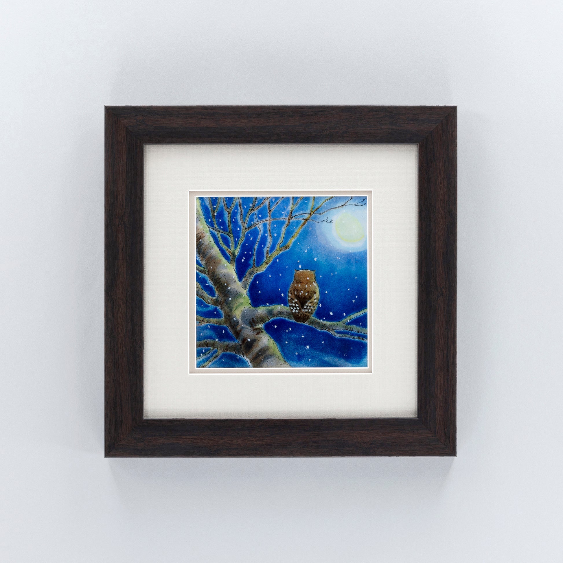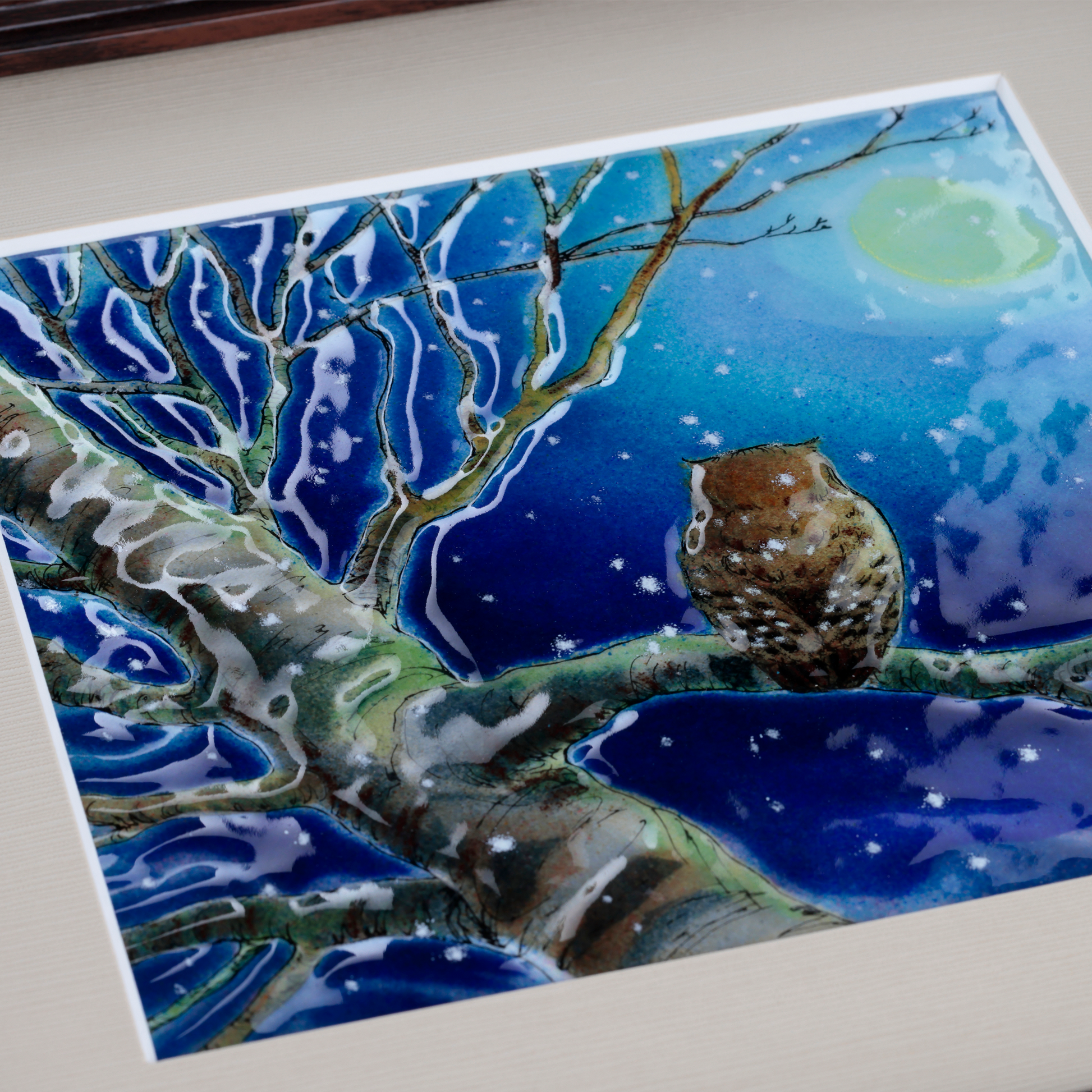 小雪の舞う中、葉を落とした木の枝にとまったふくろうは月をみて何を思うのでしょうか…とても幻想的なデザインで、何度見ても飽きない作品です。
