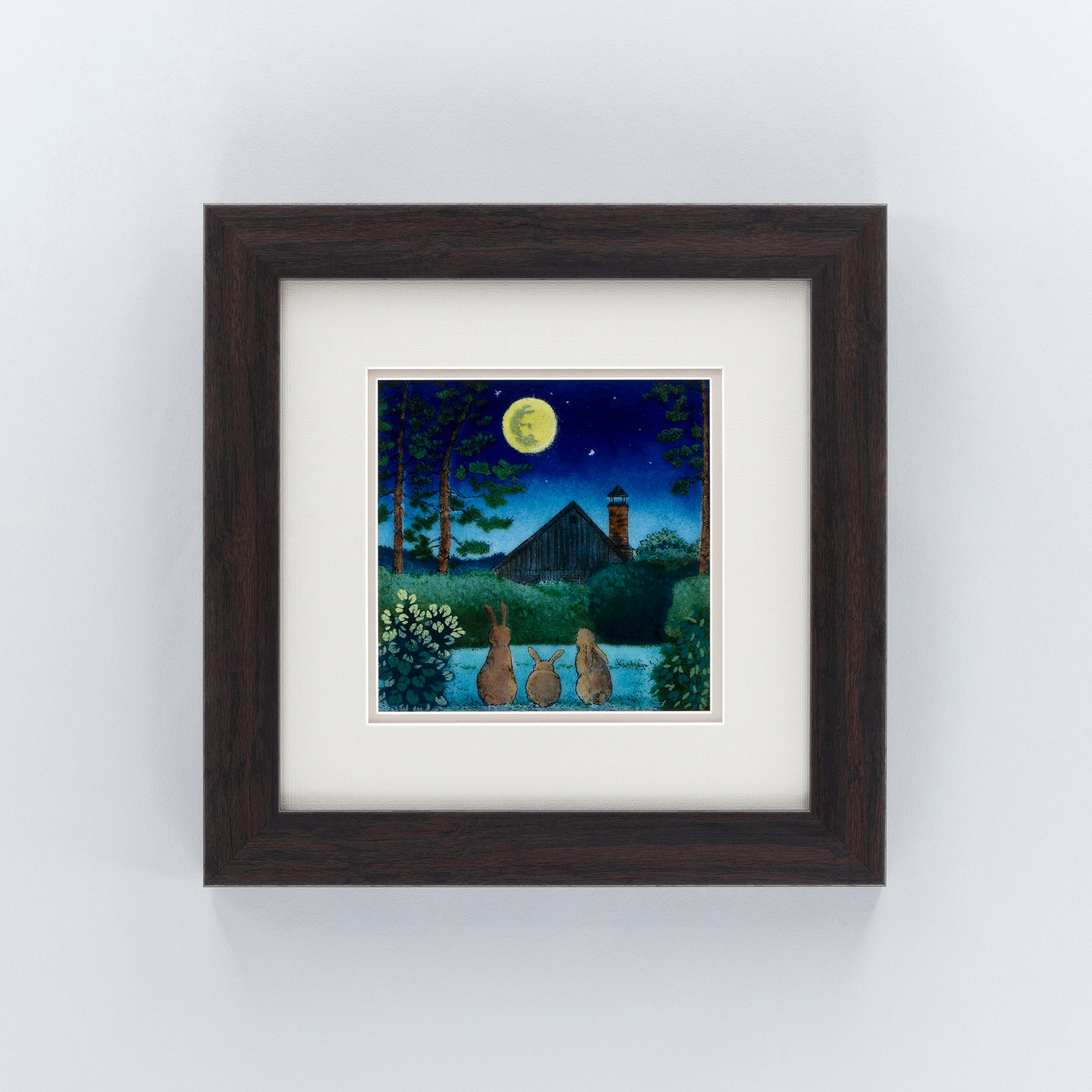 3匹の野うさぎが空にぽっかり浮かぶ満月を眺めています。