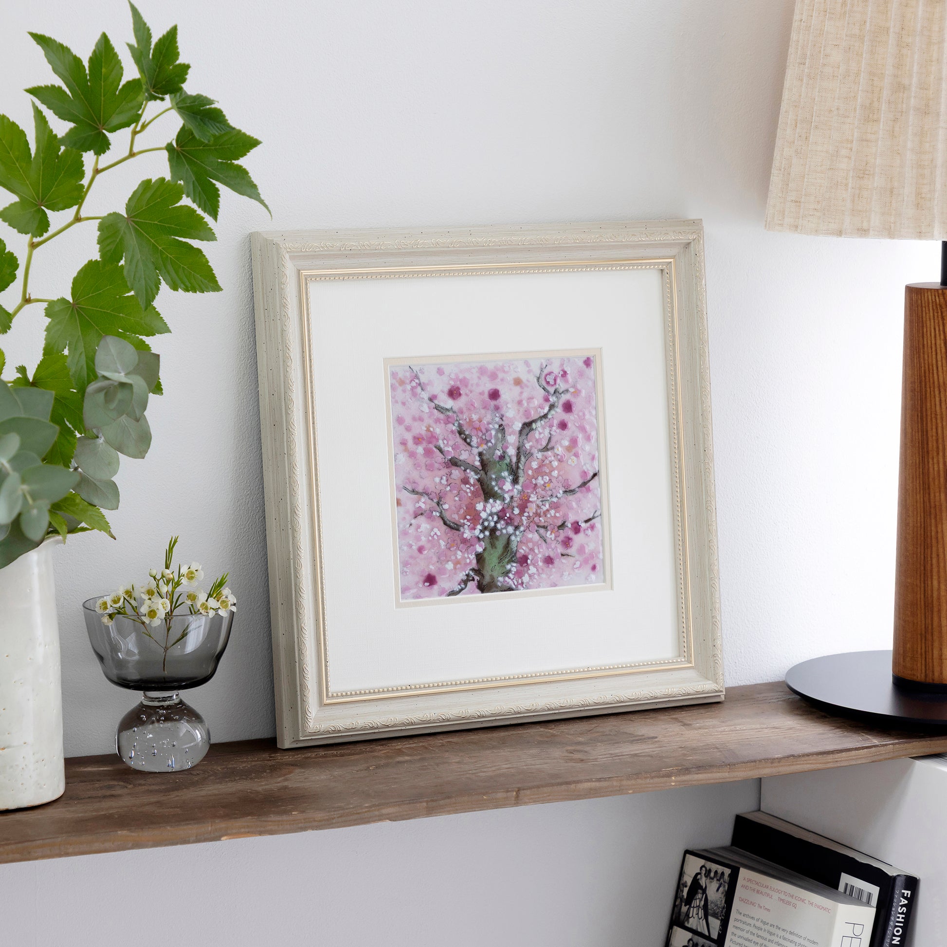 白の装飾額が華やかさと上品さを添え、明るい空間をより一層引き立てます。