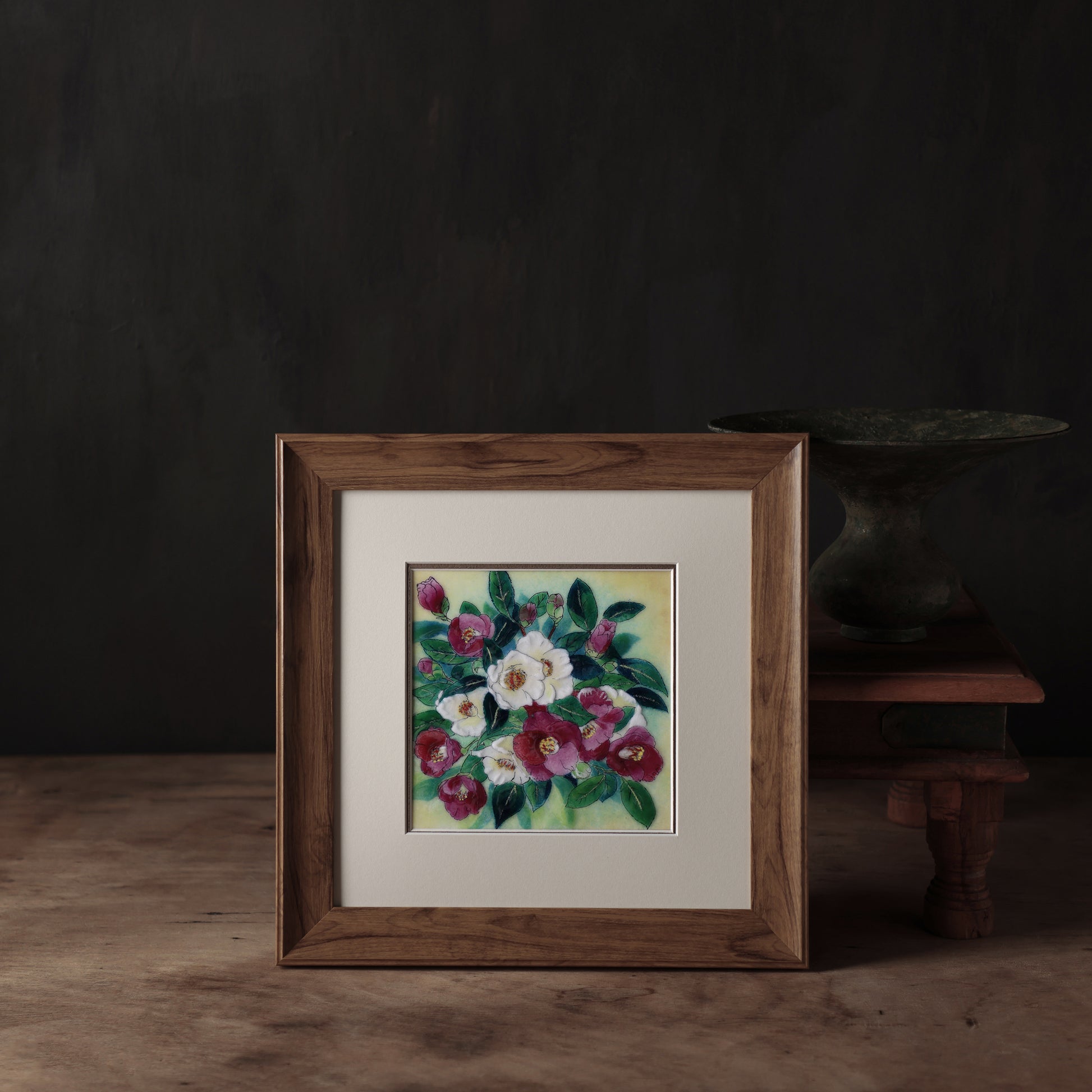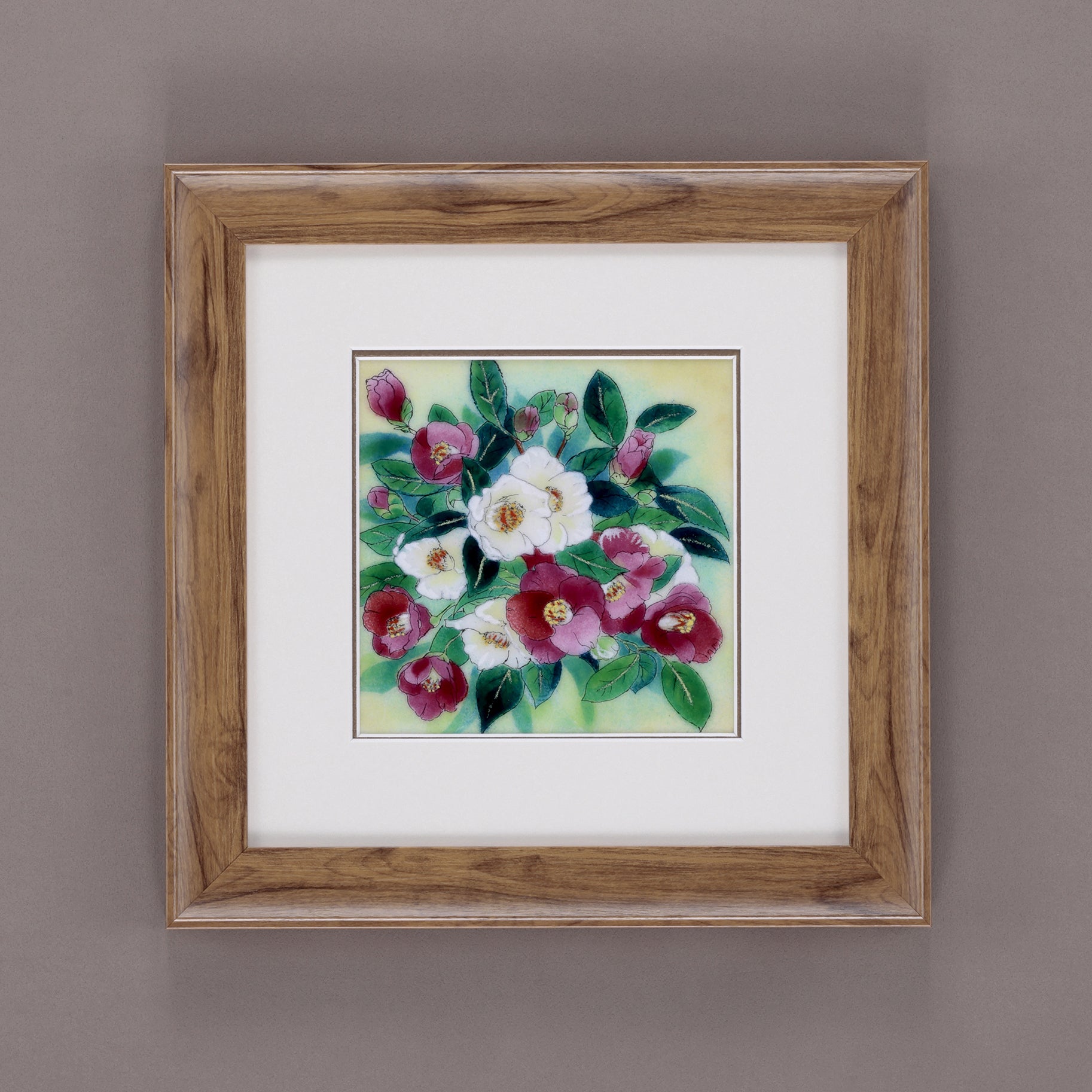 紅白の椿を花束のように描きました。 赤・白・緑の鮮やかな色合いが目をひきます。